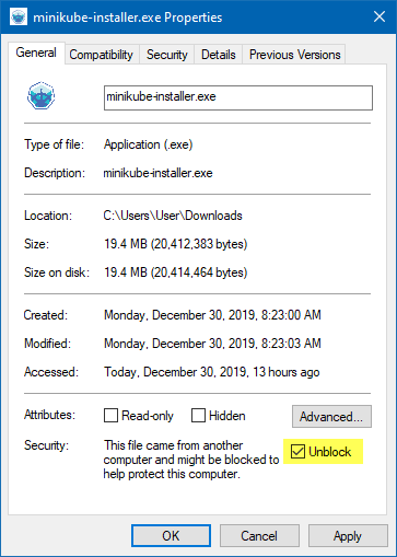 Right Click “minikube-install.exe” and make sure the file is unblocked. You can also do this with PowerShell using the “Unblock-File” cmdlet.